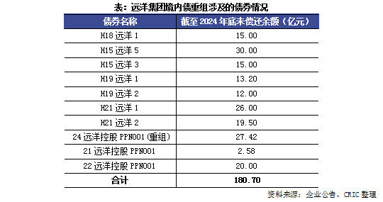 证实企业公告,本次远洋集团境内债券重组初步决策触及“H18远洋1”、“H15远洋5”、“H15远洋3”、“H19远洋1”、“H19远洋2”、“H21远洋1”及“H21远洋2”共7笔公司债以及“24远洋控股PPN001(重组)”、“21远洋控股PPN001”和“22远洋控股PPN001”3笔银行间定向债务融资器具。从企业的2024年报来看,限度2024年底这些债券的存续本金金额约为180.70亿元。