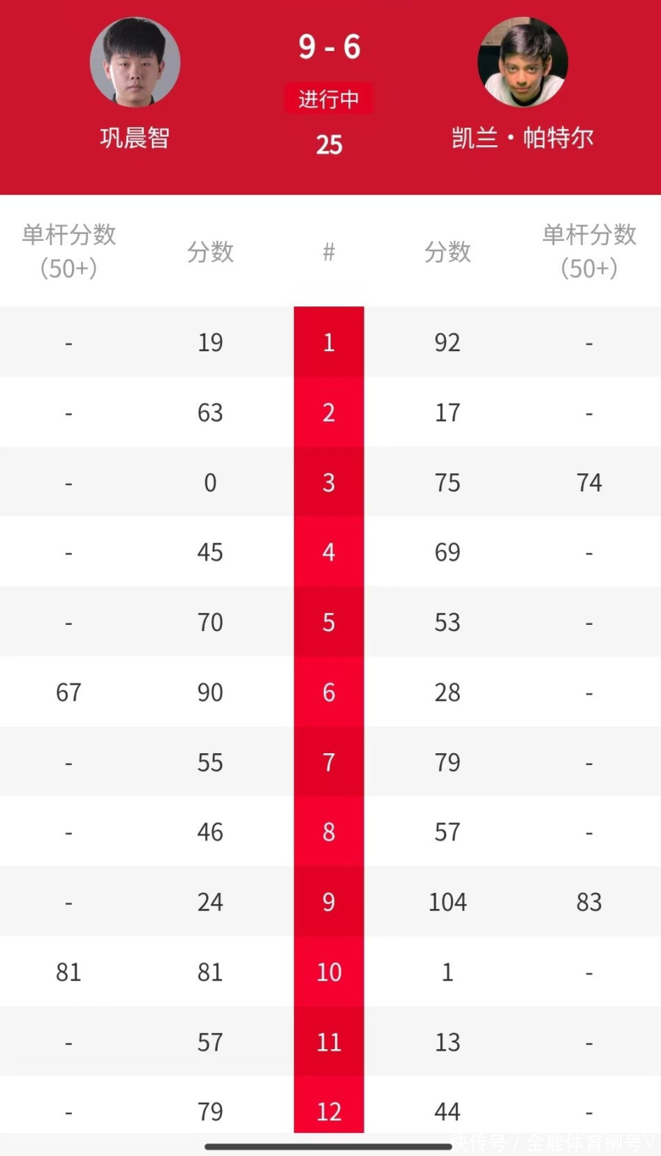第二局,巩晨智通过零敲碎打,63-17扳回一局,比分追成1-1。第三局,帕特尔打出单杆74分,75-0零封巩晨智,2-1再次朝上。