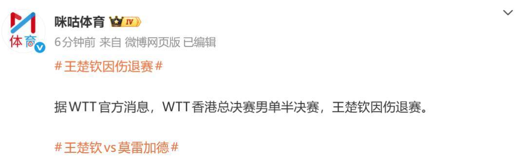 据咪咕体育报说念,WTT官方音信,WTT香港总决赛半决赛,王楚钦因伤退赛。男单决赛将于20:30进行,张本智和将对阵莫雷加德。
